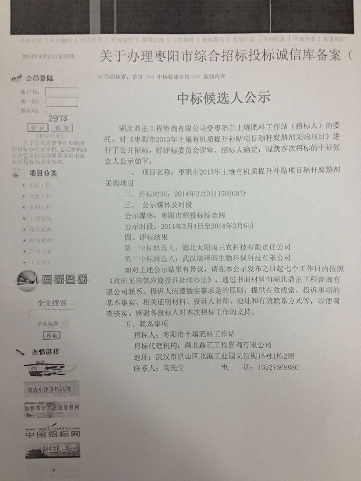 棗陽(yáng)市2013年土壤有機(jī)質(zhì)提升補(bǔ)貼項(xiàng)目秸稈腐熟劑采購(gòu)
