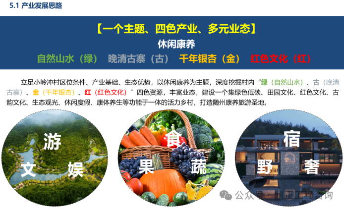 其中,雙河村通過發(fā)揮特色農(nóng)業(yè)產(chǎn)業(yè)優(yōu)勢建設(shè)農(nóng)業(yè)品牌,延伸農(nóng)業(yè)加工產(chǎn)業(yè)鏈開啟創(chuàng)收新征程,積極發(fā)展鄉(xiāng)村休閑業(yè)打造詩意田園水鄉(xiāng),主要打造田園綜合體、濱河休閑體驗,拓展農(nóng)業(yè)休閑旅游業(yè)態(tài)。泉水寺村重點結(jié)合國家級專用汽車和應(yīng)急裝備檢測研發(fā)基地的建設(shè)基礎(chǔ),構(gòu)建以產(chǎn)業(yè)基地配套服務(wù)為主導(dǎo),以生態(tài)種養(yǎng)、休閑農(nóng)業(yè)為特色的產(chǎn)業(yè)體系。小嶺沖村重點整合“綠(自然山水)、古(晚清古寨)、金(千年銀杏)、紅(紅色文化)”四色資源,構(gòu)建“綠+古+金+紅”四色產(chǎn)業(yè),打造品質(zhì)活力鄉(xiāng)村旅游。九口堰村重點以豐富的紅色文化、自然資源為基礎(chǔ),以紅色文化體驗為主導(dǎo)產(chǎn)業(yè),以文化帶動旅游,拓展紅色體驗、康養(yǎng)度假等產(chǎn)業(yè),打造全國紅色教育示范基地。
