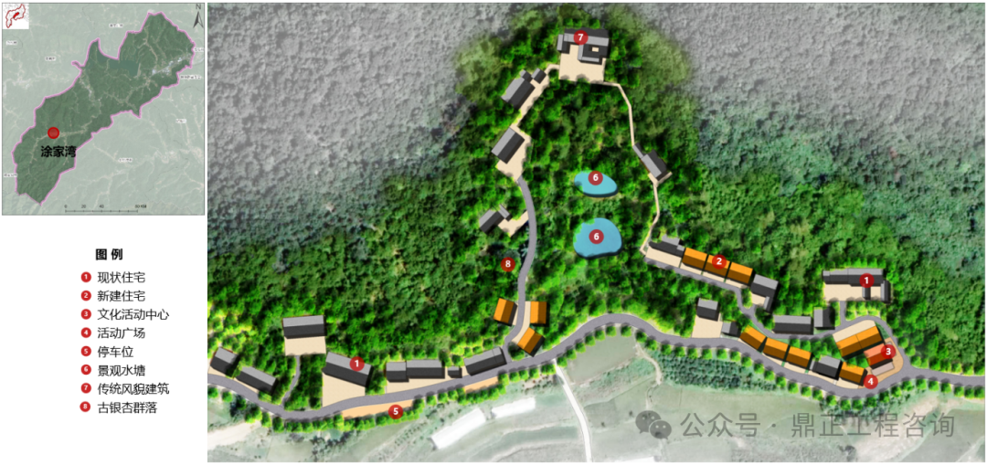 九口堰村為滿足村莊集并及遠(yuǎn)期人口增長需求,規(guī)劃于涂家灣設(shè)置一處居民安置點。場地現(xiàn)狀民居較多,地形高差大,通過梳理現(xiàn)狀閑置宅基地、拆除破舊房屋等措施整理出可以進(jìn)行布局居民點的建設(shè)用地,點狀布局居民點,居民點每戶占地140平方米,共安置12戶。